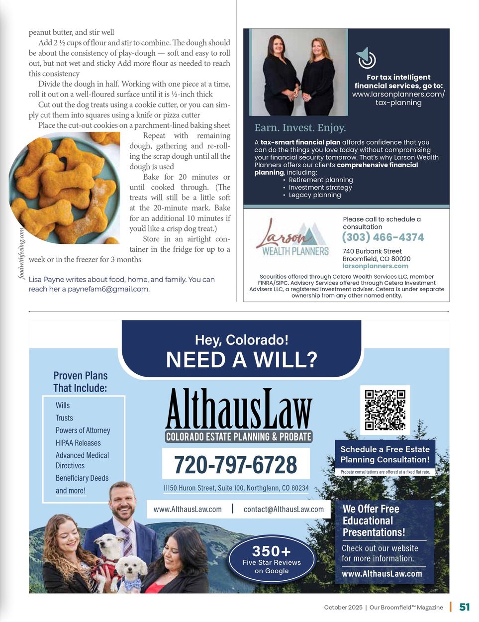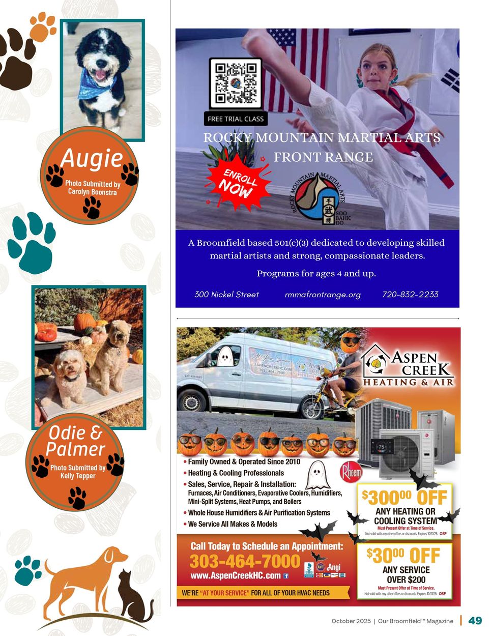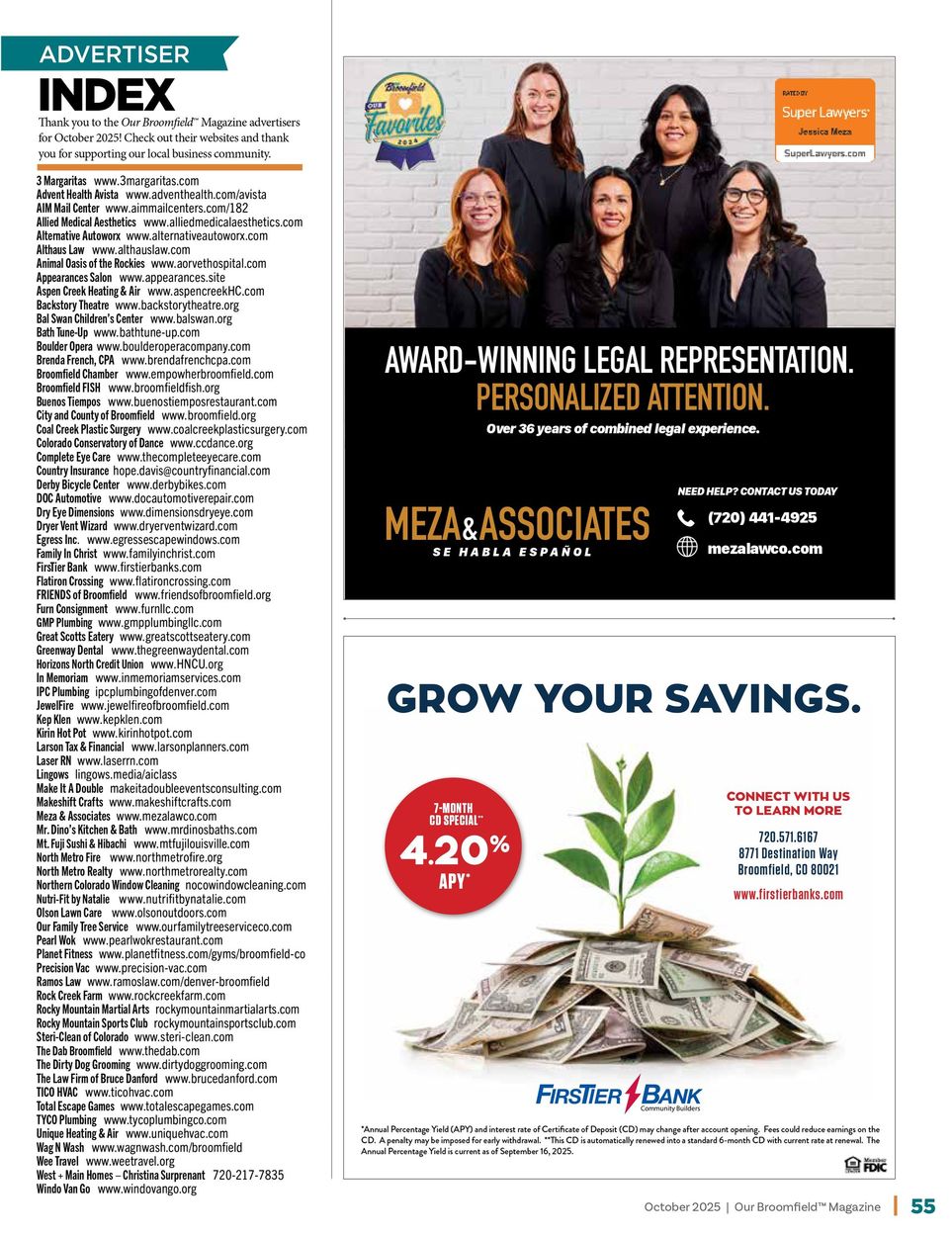 Each month, Our Broomfield Magazine partners with dozens of local businesses to highlight and promote their products and services to the Broomfield community. You can learn more about our valued Advertising Partners in this directory. Thank you for supporting local business in Broomfield! Together we are all stronger!