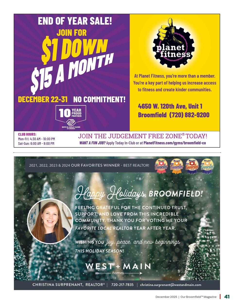 Each month, Our Broomfield Magazine partners with dozens of local businesses to highlight and promote their products and services to the Broomfield community. You can learn more about our valued Advertising Partners in this directory. Thank you for supporting local business in Broomfield! Together we are all stronger!