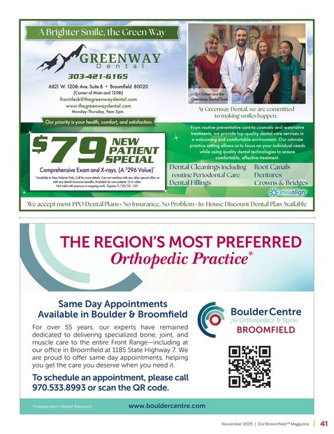 Each month, Our Broomfield Magazine partners with dozens of local businesses to highlight and promote their products and services to the Broomfield community. You can learn more about our valued Advertising Partners in this directory. Thank you for supporting local business in Broomfield! Together we are all stronger!